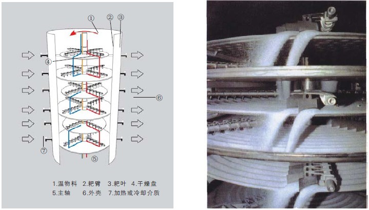 濕物料自加料器連續(xù)地加到干燥器上部第一層干燥盤上,帶有耙葉的耙臂作回轉(zhuǎn)運(yùn)動(dòng)使耙葉連續(xù)地翻抄物料。物料沿指數(shù)螺旋線渡過(guò)干燥盤表面,在小干燥盤上的物料被移送到外緣,并在外緣落到下方的大干燥盤外緣,在大干燥塔上物料向里移動(dòng)并從中間落料口落入下一層小干燥盤中。大小干燥盤上下交替排列,物料得以連續(xù)地流過(guò)整個(gè)干燥器。中空的干燥盤內(nèi)通入加熱介質(zhì),加熱介質(zhì)形式有飽和蒸汽、熱水和導(dǎo)熱油,加熱介質(zhì)由干燥盤的一端進(jìn)入,從另一端導(dǎo)出。已干物料從底層干燥盤落到殼體的底層,然后被耙葉移送到出料口排出。濕份從物料中逸出。由設(shè)在頂蓋上的排濕口排出,真空型盤式干燥器的濕氣由設(shè)在頂蓋上的真空泵抽出。從底層排出的干物料可直接包裝。通過(guò)配加翅片加熱器、溶劑回收冷凝器、袋式除塵器、干料返混木結(jié)構(gòu)、引風(fēng)機(jī)等輔機(jī),可提高其干燥的生產(chǎn)能力,干燥膏糊狀和熱敏性物料,可方便地回收溶劑,并能進(jìn)行熱解和反應(yīng)操作。
