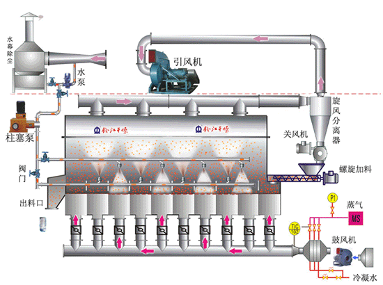 (2)塔壁上配有冷風(fēng)夾套裝置,解決了中藥浸膏粘壁問題,同時(shí)壁溫較低,不會(huì)使物料產(chǎn)生焦化變質(zhì)現(xiàn)象;